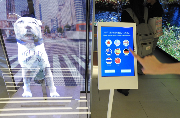 デジタル・ハチ公の右側には、専用の端末が設置。タッチパネルのディスプレーには、世界7カ国の国旗が表示されている。そのうちの1つを選択すると、デジタル・ハチ公の衣装やその周りの景色も変化し、まるで世界7カ国をハチと一緒に旅している気分が味わえるという趣向だ。