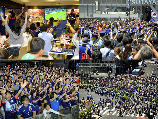 トップの「ハロウィン」同様に、渋谷スクランブル交差点が大混乱したのが6月の「サッカーW杯ブラジル大会」。2002年(平成14年)の日韓大会以来、渋谷のスクランブル交差点は「サポーターの聖地」として定着しています。今大会の初戦6月15日のコートジボワール戦は、日曜日午前中の試合開始にも関わらず、キックオフまで1時間に迫った午前9時過ぎから青いユニフォームに身を包んだサポーターの人口密度が一気に急増。まるでうねりを上げる青海波のごとく、人の波が押し寄せました。残念ながら試合には惜敗れたものの、試合後に興奮冷めやらぬサポーターたちがスクランブル交差点に集結し、応援歌を叫び、ハイタッチを繰り返す姿は、渋谷ならではのお約束の光景といえるでしょう。またハロウィンと同じく、昨今ではTwitterやFacebook、LINEなどSNSの普及に伴い、リアルタイムで画像写真が拡散し、それを見た人びとがまた集まるというアクションにも結びついています。SNSの時代だからこそ、唯一無二、そこでしか味わえないライブ(=現場で体験すること)に対する価値がより一層高まっているのではないでしょうか。