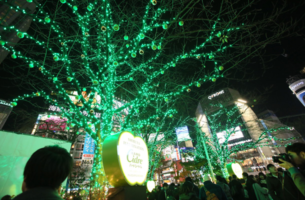 高さ約8メートルのクリスマスツリーを設置するほか、ツリー周辺の木々もライトアップで演出。約4万球の緑色LED、リンゴの基調としたオーナメントで装飾が施されている。