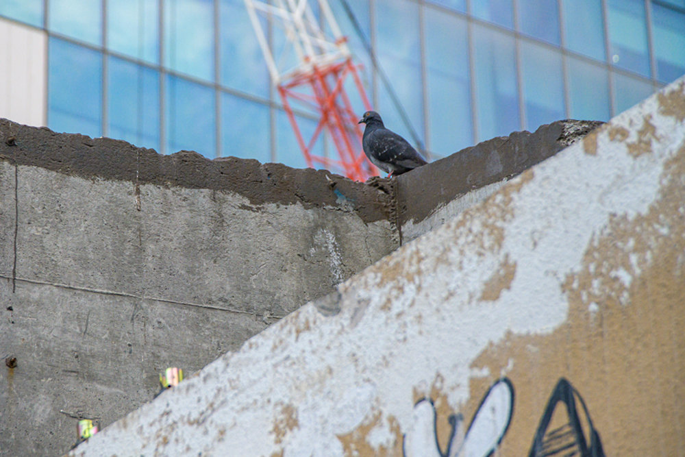 さらに階を昇ると、解体中の5階フロアのコンクリートがむき出しとなっている工事現場の最前線へとたどり着く。この世は儚く移ろいゆくものだが、ここに立つとかつての賑わいがまるで夢物語であったような不思議な感覚を覚える。日中の工事が終わった現場は静寂な空気だけが漂っていた。